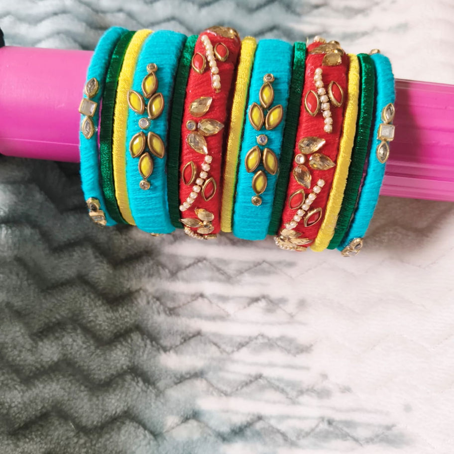 This vibrant bangle set is crafted with colorful thread work in pink, green, and black, combined with golden detailing and stone embellishments. The mix of textures gives it a festive and ethnic look, perfect for pairing with traditional outfits.