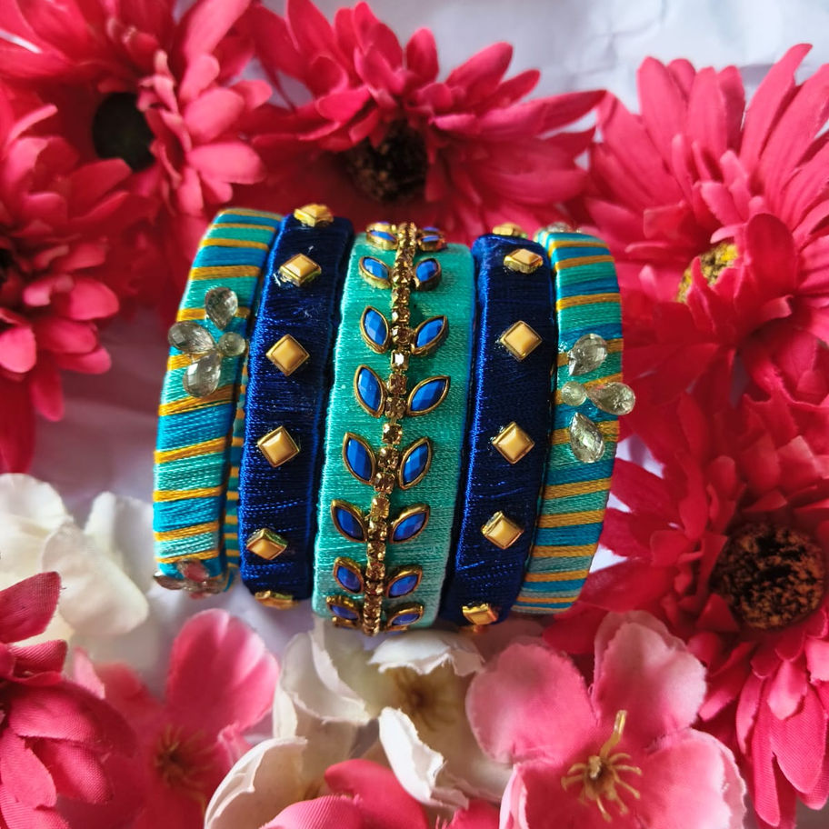 This vibrant bangle set is crafted with colorful thread work in combined with golden detailing and stone embellishments. The mix of textures gives it a festive and ethnic look, perfect for pairing with traditional outfits.